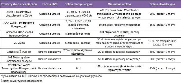 Oprócz TFI, ofert IKZE można też szukać w towarzystwach ubezpieczeń na życie. W czterech z nich (AVIVA, AXA, Compensa i PZU) IKZE stanowi oddzielną umowę ubezpieczeniową, a w trzech (Generali, ING, Pramerica) - umowę dodatkową do już posiadanej polisy ubezpieczenia na życie. Nie ma więc możliwości otwarcia w tych firmach ubezpieczeniowych samego IKZE. Wybierając konto emerytalne w postaci polisy inwestycyjnej trzeba zwrócić szczególna uwagę na koszty. Oprócz opłat manipulacyjnych (nawet kilka procent każdej wpłaty), opłat za zarządzanie funduszami musimy liczyć się tu z kosztami ochrony ubezpieczeniowej (kilka procent lub kilka złotych miesięcznie), a także koniecznością deklaracji comiesięcznych składek (np. AVIVA). W sumie IKZE zawarte w formie polisy może kosztować nawet do 10 proc. wartości środków wpłacanych na kont. Bardziej elastyczne jest IKZE zawierane jako dodatek do już posiadanej polisy. Przykładowo, Pramerica nie stawia wymogu minimalnych wpłat i nie pobiera opłat za prowadzenie IKZE (ponosimy tylko opłaty za zarządzanie funduszem). W ING z kolei minimalna miesięczna deklarowana składka wynosi 50 zł. Poza tym, w większości funduszy oferowanych w ramach umowy dodatkowej, nie jest pobierana opłata za zarządzanie.