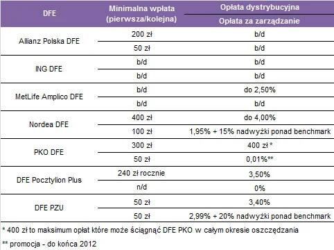 Trzecią grupą IKZE dostępną dla przyszłych inwestorów są Dobrowolne Fundusze Emerytalne prowadzone przez te same instytucje, które zarządzają OFE. Największym plusem DFE jest prostota - w każdym przypadku mówimy o jednym funduszu, jednej strategii i jasnych warunkach obciążania klientów kosztami. Opłaty dystrybucyjne wynoszą ok. 2-4 proc. każdej wpłaty (ale z czasem maleją nawet do 1 proc.), natomiast opłata za zarządzanie stanowi zazwyczaj połączenie opłaty "sztywnej" - sięgającej 1,5-3 proc. rocznie i opłaty zmiennej stanowiącej część zysku wypracowanego ponad poziom odniesienia. Ten jest zawsze ustalany na podstawie wyników warszawskiej giełdy i czasami dodatkowych wskaźników makroekonomicznych.