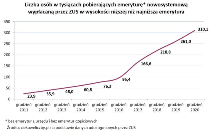 Od roku 2011 liczba osób pobierających "głodowe emerytury" rosła sukcesywnie o kilkanaście tysięcy rocznie. Wszystko zmieniło się w roku 2017, gdy rząd PiS wprowadził obniżenie wieku emerytalnego. Tylko od grudnia 2017 do grudnia 2018 przybyło 150 tys. osób otrzymujących takie emerytury.