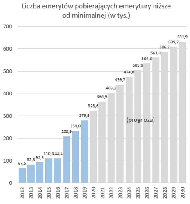 Na przestrzeni ostatnich lat ta grupa znacznie wzrosła. O ile w 2011 r. takich osób było ok. 24 tys., według danych ZUS, to w marcu 2014 r. ich liczba sięgnęła ok. 92,5 tys. W 2018 roku było to już około 234 tys. - wylicza FPP. Prognoza zakłada, że w 2020 roku będzie to 324 tys. czyli 5,5 proc. emerytów ogółem będzie otrzymywać emeryturę "sub-minimalną".