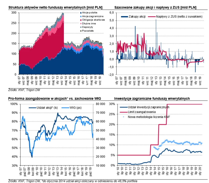 "Alokacja OFE w polskie akcje wzrosła o 1,3 pp m/m do 72,7 proc. i jest poniżej progu 75 proc., który miał obowiązywać według nowej reformy na dzień 27 listopada 2020. 8 z 10 funduszy jest poniżej tego progu i do jego osiągnięcia brakuje im 3,1 mld zł" - podał Trigon DM.