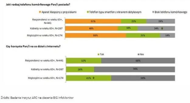 Z badania zrealizowanego na zlecenie BIG InfoMonitor wynika, że co czwarty senior nie posiada telefonu komórkowego, częściej są to kobiety - bo co trzecia (34 proc.), podczas gdy wśród panów nie ma komórki jedynie co siódmy (14 proc.). Choć należy zauważyć, że w najmłodszej grupie seniorów 65-74 lata rozpowszechnienie telefonów komórkowych wynosi 80 proc. z czego 30 proc. to smartfony. Komórki są zdecydowanie częściej w posiadaniu mieszkańców największych miast (85 proc.) niż wsi (63 proc.).