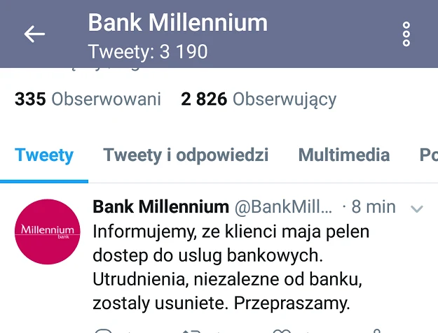 Od godziny ok. 17.30 w Banku Millennium zaczęła się awaria systemu, w rezultacie nie działały m.in. aplikacja mobilna, bankowość internetowa i bankomaty. Również z usługami w oddziałach oraz kontaktem z infolinią były problemy.