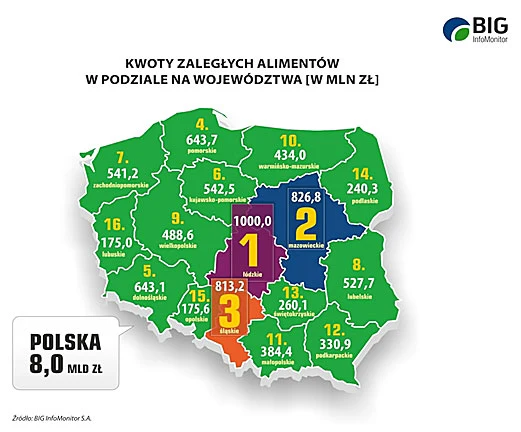 Z danych przekazywanych przez samorządy do BIG InfoMonitor wynika, że najwięcej swoim dzieciom winni są mieszkańcy łódzkiego. Kwota długów z niezapłaconych alimentów, które musiało wziąć na swoje barki państwo, narosła tu już do 1 miliarda złotych.