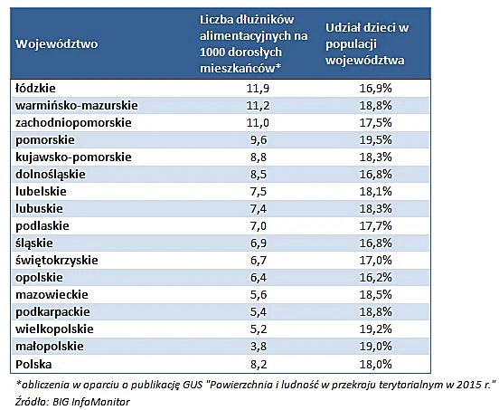W Łódzkiem rekordowa jest też liczba dłużników alimentacyjnych przypadająca na 1000 dorosłych mieszkańców - sięga niemal 12 osób na 1000. Gorzej niż przeciętnie sytuacja wygląda również w województwach warmińsko-mazurskim i zachodniopomorskim, gdzie na 1000 dorosłych przypada ok. 11 dłużników alimentacyjnych. Znacząco na minus wyróżnia się też woj. pomorskie, gdzie wśród 1000 dorosłych mieszkańców jest prawie 10 osób z długiem alimentacyjnym wpisanym do rejestru dłużników. Przeciętnie w kraju 8,2 osoby na 1000 ma dług alimentacyjny, co oznacza, że statystycznie jeden na 121 dorosłych Polaków, to rodzic, który nie chce utrzymywać swojego dziecka i z tego powodu wpisany jest do BIG.