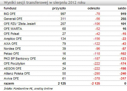 Nowe regulacje całkowicie zmieniły sytuację na rynku. Przykładowo jeszcze w 2011 roku, bilans przyjść i odejść dla ING OFE, w każdej sesji wynosił średnio -12,8 tys. Obecnie ING OFE drugi raz z rzędu ma dodatnie saldo, które wyniosło w sierpniu ponad +0,9 tys. przerejestrowanych członków. Warto podkreślić, że fundusz ten osiąga ponadprzeciętne wyniki i bardzo dobrze wypada w naszych comiesięcznych rankingach.