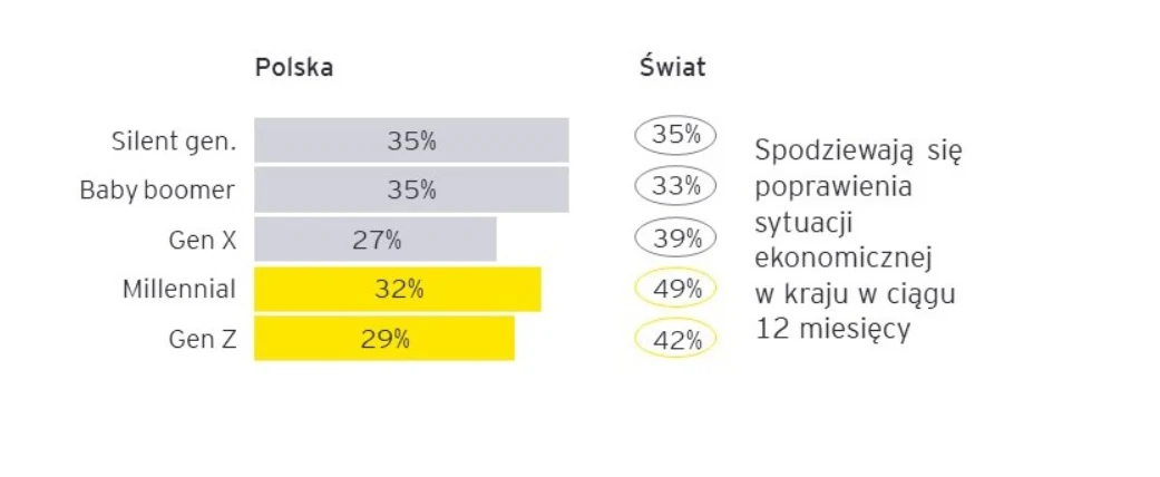 Badanie EY Future Consumer Index wykazało, że o ile najbardziej zaawansowani wiekowo Polacy lepiej oceniają perspektywy poprawy sytuacji gospodarczej kraju niż ich własnej (Silent generation - 35 proc. vs. 18 proc.) to młodsze osoby postrzegają sytuację dokładnie odwrotnie. Jedynie 29 proc. przedstawicieli Generacji Z wierzy w pozytywną zmianę sytuacji finansów publicznych, a 56 proc. - ich własnych. Warty odnotowania jest również fakt, że w przypadku starszych pokoleń wyniki w Polsce i na świecie są niemal identyczne. Od poziomu Generacji X następuje znaczne rozwarstwienie i większy pesymizm wśród naszych rodaków. Stanowi to potwierdzenie, że najmłodsze pokolenia wierzą iż swój osobisty dobrobyt muszą budować niezależnie od sytuacji gospodarczej państwa, natomiast najstarsze osoby są od niej znacznie bardziej zależne.