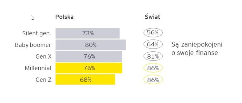 Sytuacja epidemiologiczna znacząco pogłębiła zaniepokojenie o stabilność finansową zdecydowanej większości Polaków, niezależnie od pokolenia. Różnica pomiędzy najbardziej niepewną grupą (Baby Boomers - 80 proc.), a najmniej (Generacja Z - 68 proc.) wyniosła zaledwie 12 punktów procentowych. Co ciekawe, Polska znacząco odbiega od średnich światowych, gdzie młodsze pokolenia wykazują większe zaniepokojenie, a starsze - mniejsze (np. Baby Boomers - 80 proc. vs. 64 proc. , a Gen Z - 68 proc. vs 86 proc.).