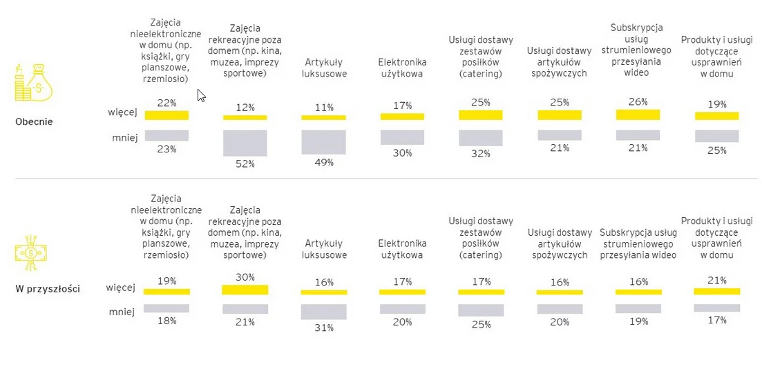 Branże takie muszą liczyć się z potencjalnym spadkiem dochodów. Ważna jest zatem nie tylko adaptacja do obecnej sytuacji, ale i przygotowanie strategii działania na przyszłość. Dotyczy to tych branż którzy zyskali dzięki pandemii jak i tych w które pandemia uderzyła najmocniej. - podsumowuje Grzegorz Przytuła, Associate Partner EY-Parthenon, ekspert Sektora Handlu i Produktów Konsumenckich EY.Dzięki większej ilości czasu spędzanego w domu, znaczna część respondentów zwiększyła swoje wydatki na remonty i domowe usprawnienia oraz rozrywkę - 22 proc. konsumentów deklarowało zwiększenie funduszy na ten obszar, a 23 proc. - spadek. Zyskały za to aspekty będące bezpośrednim efektem pandemicznych ograniczeń tj. dostawy artykułów spożywczych oraz subskrypcji. Jednocześnie obie kategorie znalazły się w gronie sektorów gospodarki, które w kolejnych latach mogą mierzyć się ze spadkami. Ma to bezpośredni związek ze zmianą cyklu zachowań konsumentów w okresie post-pandemicznym m.in. 31 proc. Polaków jest przekonanych, że w przeciągu 3 lat sposób robienia zakupów wróci do stanu przed epidemią.