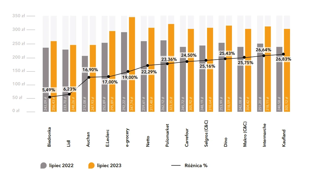 "Największe podwyżki odnotowano w sklepach Selgros Cash & Carry - 20,13 zł (6,93 proc.). W ujęciu rocznym wzrost cen badanych produktów zaobserwowano we wszystkich 13 analizowanych sieciach. Były to min.: Intermarché (26,64 proc.), Makro Cash & Carry (25,75 proc.) czy Dino (25,43 proc.). Największy wzrost cen koszyka odnotowano w sieci Kaufland, w którym średnia cena koszyka w lipcu 2023 r. była wyższa aż o 64,54 zł niż przed rokiem, tj. o 26,83 proc." - poinformowano.