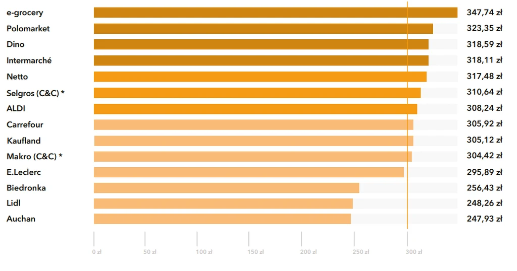 Porównując najtańszy i najdroższy koszyk okazuje się, że różnica jest spora i wynosi 141,77 zł. Analitycy wskazują że wartość koszyka zakupowego całościowo zwiększyła się o 20,70 proc. z 249,04 zł w lipcu 2022 r. do 300,58 zł w lipcu 2023 r. Najmniej za zakupy trzeba było zapłacić w Auchan, tuż za nim uplasował się Lidl (różnica o 0,33 zł). Podium zamknęła Biedronka (różnica to 8,50 zł do lidera).