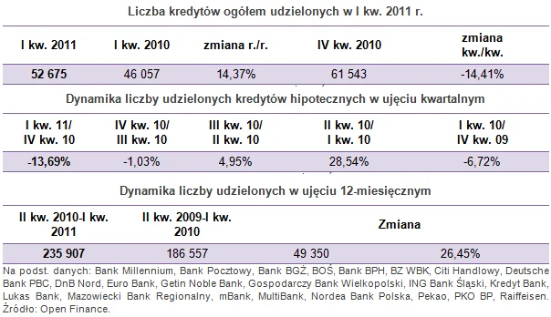 Pierwszy kwartał 2011 roku był piątym z rzędu wzrostowym, porównując do analogicznego okresu roku poprzedniego. Wcześniej dziesięć razy z rzędu odnotowywaliśmy spadek liczby udzielonych kredytów rok do roku. Rok 2010 był od 2009 lepszy ze względu na niską bazę - w pierwszym półroczu 2009 sprzedaż spadała w następstwie zamrożenia akcji kredytowej przez banki po globalnym kryzysie finansowym.