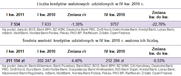 Kredyty walutowe stanowiły w pierwszym kwartale 2011 roku 14,19 proc., a rok wcześniej było to 16,47 proc. W ujęciu kwartalnym także odnotowaliśmy spadek odsetka kredytów w walutach obcych - z poziomu 15,85 proc. w czwartym kwartale 2010 roku. Nominalnie liczba udzielonych kredytów walutowych spadła w stosunku do analogicznego okresu ubiegłego roku o 1,3 proc.