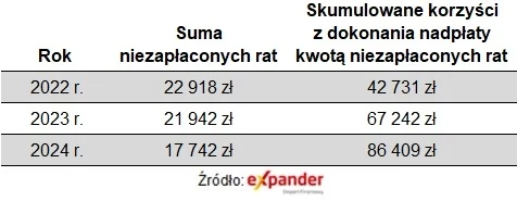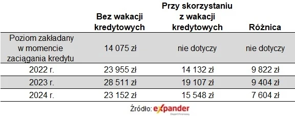 Jak wylicza Jaroslaw Sadowski, główny analityk Expandera skumulowane korzyści z nadpłat, jeśli ktoś przeznaczył na to kwoty zaoszczędzone w ramach wakacji przy kredycie na 300 tys. zł, na 30 lat, udzielonego w kwietniu 2021 r., sięgną 37 tys. zł (przy założeniu, że WIBOR 3M będzie nadal spadał i w IV kw. 2024 r. wyniesie 4 proc.). Przy kredycie na tych samych warunkach, ale zaciągniętym na 700 tys. zł, byłoby to już łącznie 86 tys. zł.