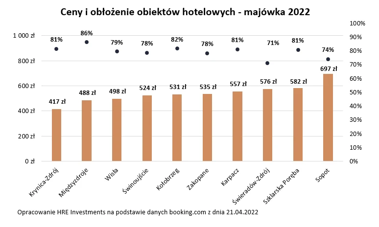 Na drugim biegunie mamy Wisłę, Międzyzdroje czy Krynicę-Zdrój. W tych ośrodkach przeciętna stawka ofertowa wynosi około 400 do 500 złotych za dobę. Nie jest to niska cena, a mimo tego w Międzyzdrojach obłożenie zbliża się do 90 proc. W praktyce oznacza to, że jeśli ktoś chciałby się tam wybrać na najbliższy długi weekend, to oferta jest już bardzo przebrana.