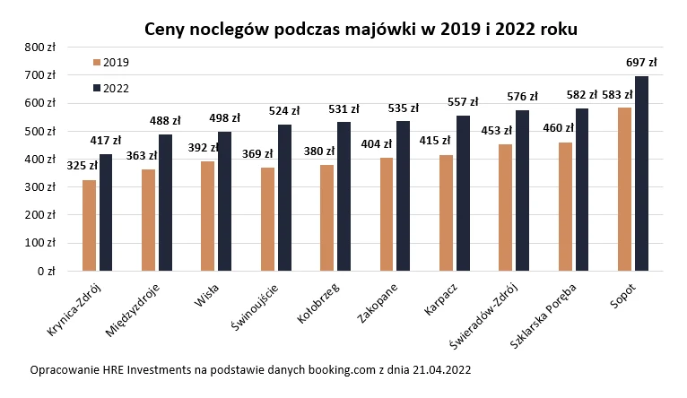 540 złotych - tyle średnio trzeba zapłacić za nocleg dla dwóch osób podczas tegorocznej majówki w 10 popularnych miejscowościach turystycznych - tak wynika z szacunków HRE Investments opartych o dane popularnego portalu rezerwacyjnego.