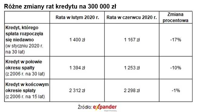 Dla przykładu weźmy kredyt na 300 000 zł, udzielony w styczniu 2006 r. na okres 15 lat. Jego spłata skończy się więc już za kilka miesięcy. W lutym rata takiego kredytu wynosiła 2312 zł, a obecnie spadła do 2298 zł, a więc o niecały 1 proc.