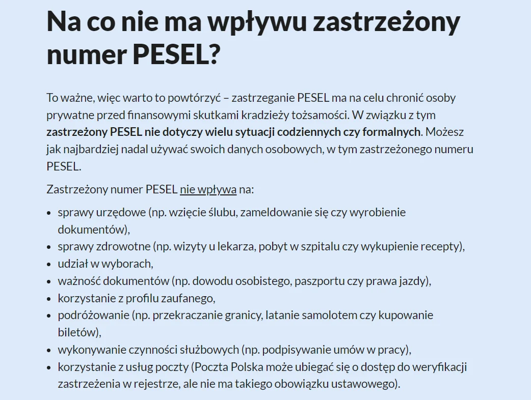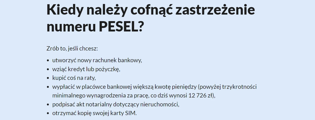 Trzeba więc pamiętać o cofnięciu zastrzeżenia numeru PESEL, kiedy chcemy załatwić niektóre sprawy z bankami, SKOK-ami i innymi instytucjami finansowymi oraz notariuszami i operatorami telekomunikacyjnymi.