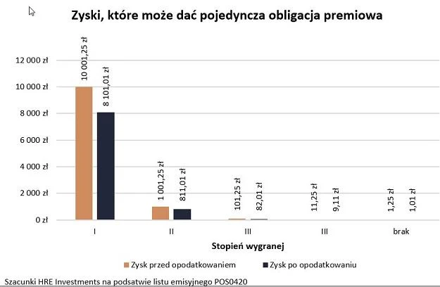 Lepiej sytuacja wygląda w przypadku wylosowania najniższej nawet premii. Ale Uwaga! Każda premia, dyskonto czy oprocentowanie wypłacone przez ministra finansów podlegają opodatkowaniu. Zasada jest taka, że każda obligacja kupiona za 100 złotych po 10 miesiącach daje 1,25 złotych odsetek (1,01 po opodatkowaniu) oraz możliwość wygrania premii pieniężnej. Ta może wynosić od 10 złotych do 10 tysięcy złotych. Premia przed wypłatą na konto inwestora także jest pomniejszana o 19% podatku.