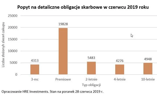 Przed rokiem - gdy ministerstwo po raz pierwszy sprzedawało takie obligacje - Polacy złożyli na nie ponad 16 tysięcy zapisów, co skutkowało sprzedażą papierów o wartości ponad 371 mln złotych. Rankiem 28 czerwca 2019 roku zleceń zakupu papierów premiowych było już prawie 20 tysięcy. Co ważne, w ostatnich dniach miesiąca sprzedaż obligacji przeważnie wyraźnie rośnie. Jeśli byłoby tak i tym razem, to do końca czerwca Polacy mogą złożyć nawet około 25 tysięcy zleceń zakupu papierów premiowych na kwotę nawet ponad pół miliarda złotych.