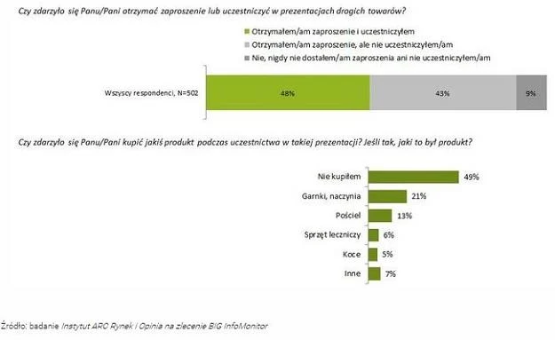 Spytaliśmy osoby będące już na emeryturze, czy otrzymały zaproszenie na prezentacje drogich towarów. Twierdząco odpowiedziało aż 91 proc. badanych. Z badania** przeprowadzonego przez Instytut ARC Rynek i Opinia na zlecenie BIG InfoMonitor wynika też, że niemal połowa emerytów zdecydowała się pójść na takie spotkanie (48 proc.). Z tego grona aż 51 proc. dokonało zakupu. Kupili przede wszystkim garnki i naczynia, pościel, sprzęt leczniczy, koce oraz inne towary czy usługi, wśród których coraz częściej pojawiają się abonamenty na usługi medyczne.