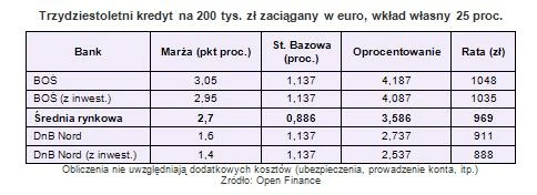 Promocja, która potrwa do końca listopada w banku DnB Nord dotyczy kredytów w euro od 200 tys. zł. Marża kredytu, niezależnie od wielkości wkładu własnego, wynosi 1,8 pkt proc., a dla kredytów od 400 tys. zł 1,6 pkt proc. Dodatkowo, bank nie pobiera prowizji. Przed klientem stawiane są jednak dwa wymogi: konto z wpływami min. 5 tys. zł miesięcznie i karta kredytowa.