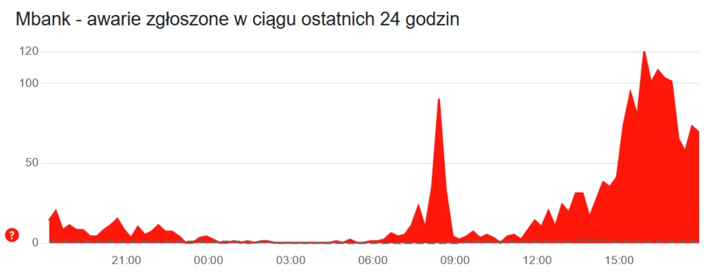 Zbierający informacje o awariach awariach serwis Downdetector pokazywał, że ok. 18.00 w poniedziałek klienci mBanku wciąż mieli problemy z korzystaniem z usług swojego banku.