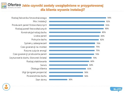 Osoby, którym zależy na maksymalnym obniżeniu kosztów instalacji, powinny przede wszystkim poznać czynniki, które wpływają na ostateczną cenę. Wykonawcy, którzy wzięli udział w badaniu Oferteo.pl i Muratora, zaliczali do nich przede wszystkim: rodzaj falownika (94 proc.), moc instalacji (92 proc.), producenta komponentów (91 proc.), a także rodzaj dachu (jego pokrycie i usytuowanie).