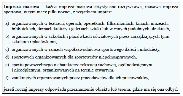 Impreza masowa - każda impreza masowa artystyczno-rozrywkowa, masowa impreza sportowa, w tym mecz piłki nożnej, z wyjątkiem imprez: