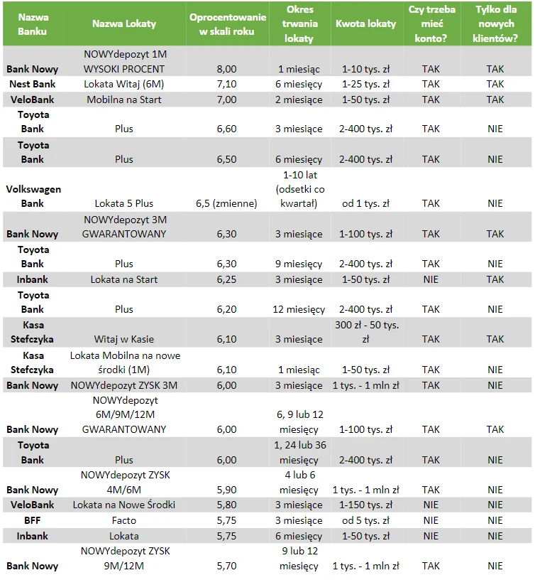 Tabela uwzględnia jedynie lokaty, które można swobodnie założyć. Na rynku jest jeszcze kilka produktów, które mają stosunkowo wysokie oprocentowanie, ale przy których trzeba spełniać dodatkowe warunki, poza często wymaganym posiadaniem podstawowego konta. To np. "Lokata Urodzinowa" Banku Millennium. Można z niej skorzystać jedynie w ciągu 30 dni od dnia urodzin. Obecne oprocentowanie tej 1-miesięcznej lokaty w skali roku wynosi 6 procent.