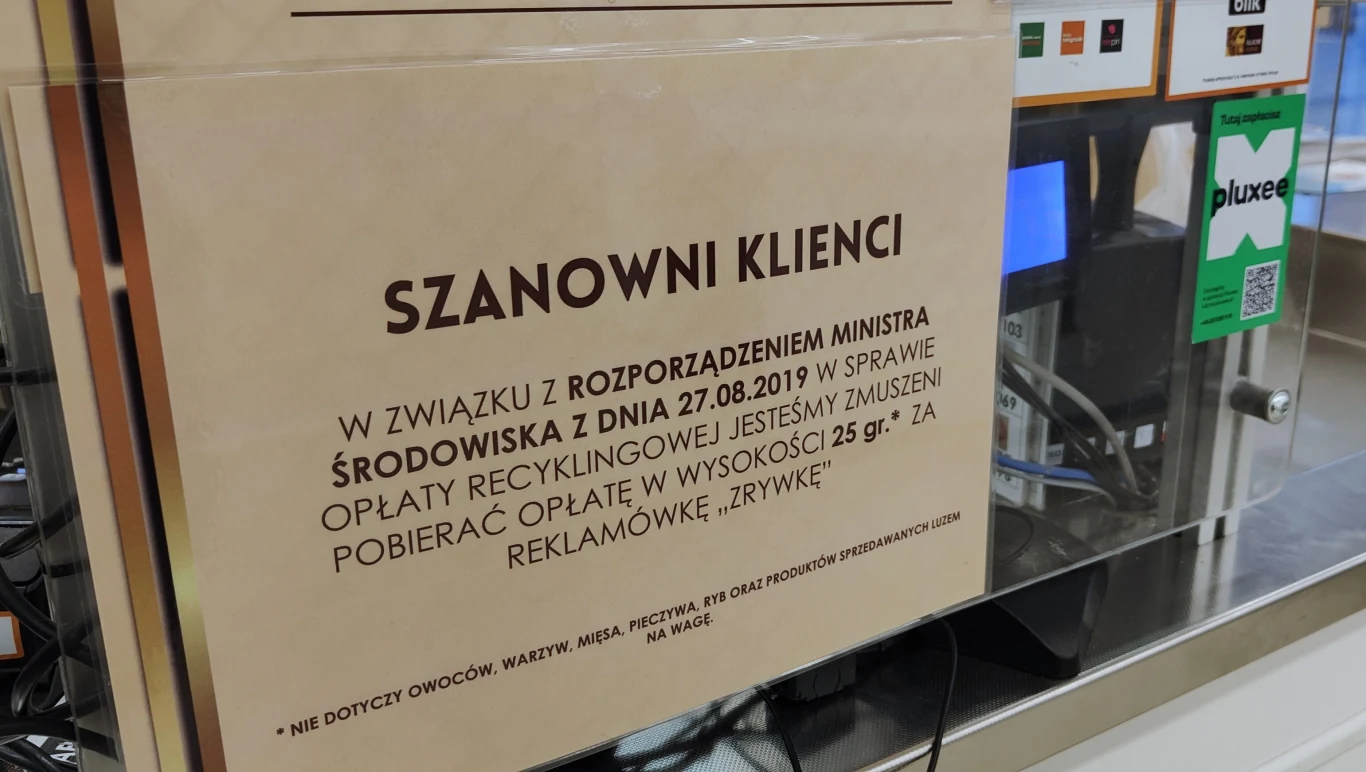 "Szanowni Klienci, w związku z rozporządzeniem Ministra Środowiska z dnia 27.08.2019 w sprawie opłaty recyklingowej, jesteśmy zmuszeni pobierać opłatę w wysokości 25 groszy za reklamówkę zrywkę", czytamy w informacji zamieszczonej przy kasie sieci sklepów Frac. Sklep dodaje, że opłata nie dotyczy owoców, warzyw, mięsa, pieczywa, ryb oraz produktów sprzedawanych luzem na wagę.