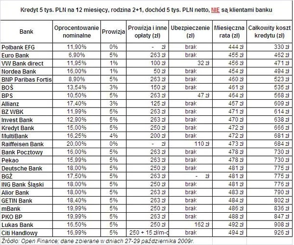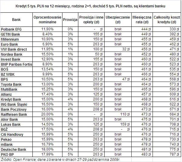 W przypadku nowych klientów najlepsze oferty znaleźliśmy w Polbanku, Eurobanku i Volkswagen Banku direct. Całkowity koszt tych pożyczek nie przekracza 500 zł. W przypadku Polbanku mamy identyczną ofertę jak dla stałych klientów. Eurobank z kolei wprowadził promocję i obniżył oprocentowanie do 6,9 proc. Klienci, którzy w terminie zapłacą ratę, po dwóch tygodniach dostaną różnicę między ratą wynikającą z oprocentowania standardowego, a tego promocyjnego. W VW Banku direct oprocentowanie wynosi 11,95 proc., prowizja też jest niska (1 proc.), ale dochodzi obowiązkowe ubezpieczenie.