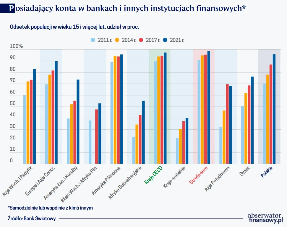 Polska na tym tle z powodzeniem zasługuje na miano kraju wysoko już rozwiniętego. W 2021 r. według danych z raportu Banku Światowego własne konta posiadało 96 proc. dorosłych lub prawie dorosłych mieszkańców naszego kraju. Jest to efekt bardzo szybkiego "ubankowienia" naszego społeczeństwa w ostatnich latach. Jeszcze dekadę temu udział posiadających własne konta wśród osób dorosłych wynosił w Polsce tylko 70 proc., wobec 88 proc. w krajach zaliczanych do wysoko rozwiniętych, o najwyższych dochodach (high income według terminologii Banku Światowego). W ubiegłym roku Polska dorównała średnim wynikom najbogatszych krajów świata.