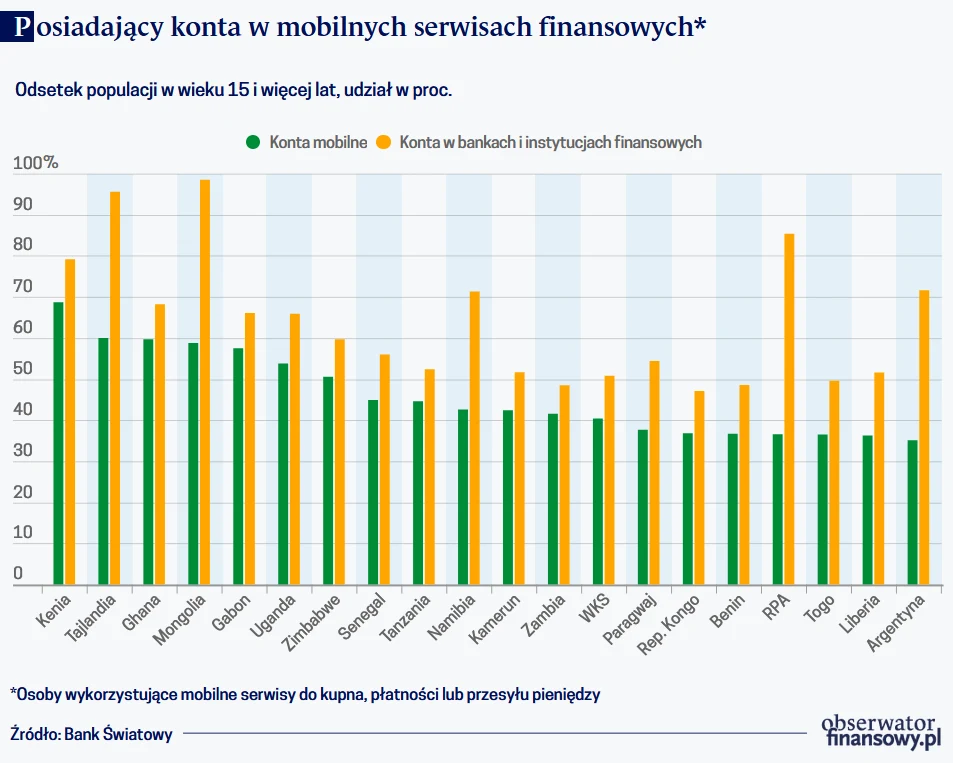 Z danych Banku Światowego wynika, że w krajach na południe od Sahary, czyli na obszarze szczególnej uwagi ze strony tej instytucji, 55 proc. osób w wieku 15 i więcej lat, posiadało w 2021 r. własne konta bankowe. Aż 33 proc. wszystkich dorosłych posiadało konta mobilne. To rekordowy w świecie udział bankowości mobilnej w relacji do tradycyjnej, stacjonarnej.