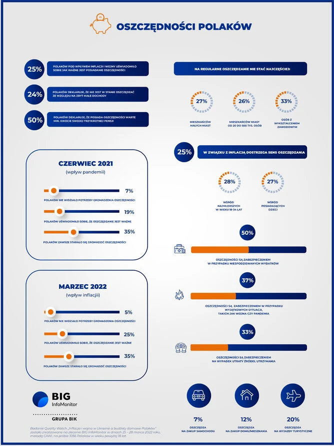 - Kryzysowe sytuacje zawsze przekładają się na to, że chcemy zwiększyć poczucie swojego bezpieczeństwa. W kwestii oszczędności, wojna w Ukrainie i postępująca inflacja wpływają na nas zdecydowanie mocniej niż pandemia koronawirusa. Po ponad roku pandemii 7 proc. Polaków nie widziało potrzeby gromadzenia oszczędności, a 19 proc. uświadomiło sobie, że oszczędzanie jest ważne. W wyniku przyspieszenia inflacji i wybuchu wojny udział osób niewidzących potrzeby oszczędzania spadł do 4 proc., a odsetek osób, które ją dostrzegają wzrósł do 25 proc., szczególnie wśród przedstawicieli najmłodszych pokoleń. Fakt, że wchodzący w dorosłość zderzają się z takimi wyzwaniami jak pandemia, a teraz wojna i bardzo wysoka inflacja, z pewnością będzie miał wpływ na ich podejście do finansów przez całe życie - mówi Sławomir Grzelczak, prezes BIG InfoMonitor, prowadzącego rejestr dłużników konsumentów i firm.