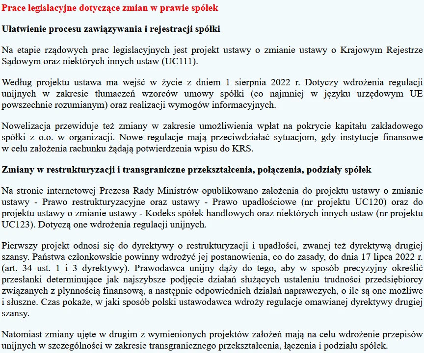 Poza tym mogą być wprowadzone także inne zmiany dotyczące funkcjonowania spółek ze względu na trwające prace legislacyjne (patrz ramka).