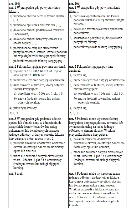 Kolejne zmiany mają dotyczyć art. 106j ustawy o VAT, a ich celem jest uproszczenie przepisów i zmniejszenie obowiązków związanych z rozliczaniem VAT. Proponuje się rezygnację z wymogu umieszczania na fakturze korygującej: