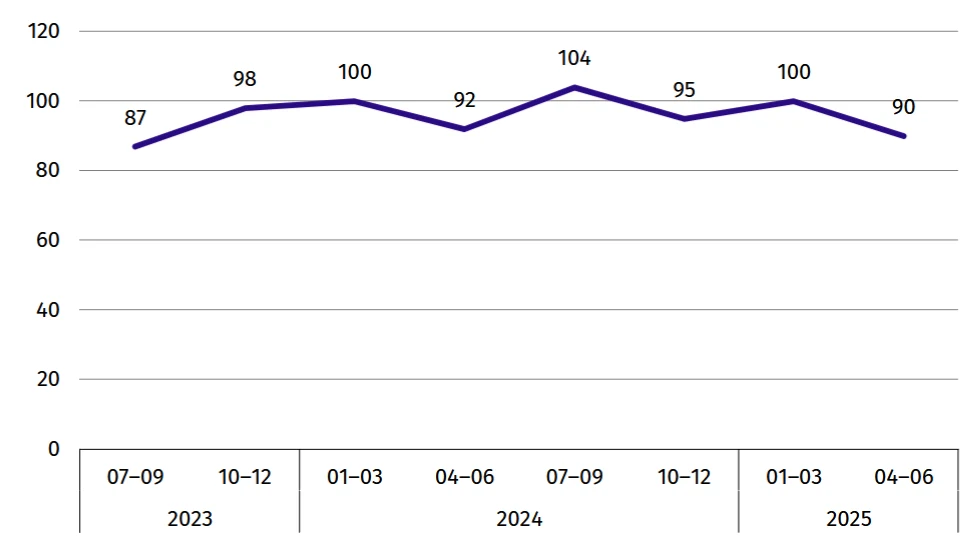 W II kwartale 2025 r. zanotowano upadłość 90 przedsiębiorstw (wobec 92 w analogicznym okresie roku poprzedniego). Spadek liczby upadłości zanotowano w: usługach, handlu; naprawie pojazdów samochodowych oraz zakwaterowaniu i gastronomii.