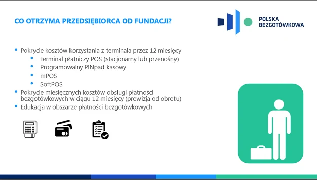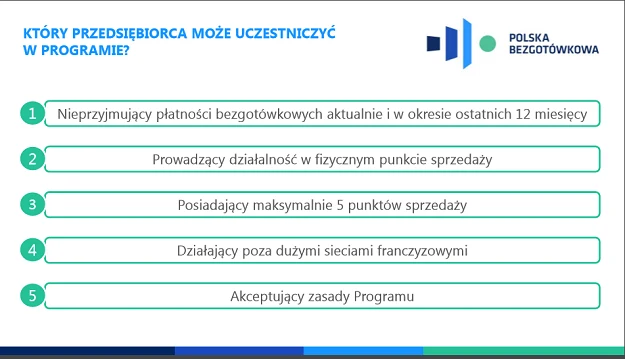 Program "Polska Bezgotówkowa" wystartował operacyjnie na początku lutego. Ma zachęcić do przyjmowania płatności bezgotówkowych. Przedsiębiorca (punkt usługowy lub handlowy) nie ponosi jakichkolwiek kosztów związanych z posiadaniem terminala ani kosztów związanych z samą transakcją, pod warunkiem jednak, że nie przekroczy 100 tys. zł obrotu rocznie na jeden terminal.