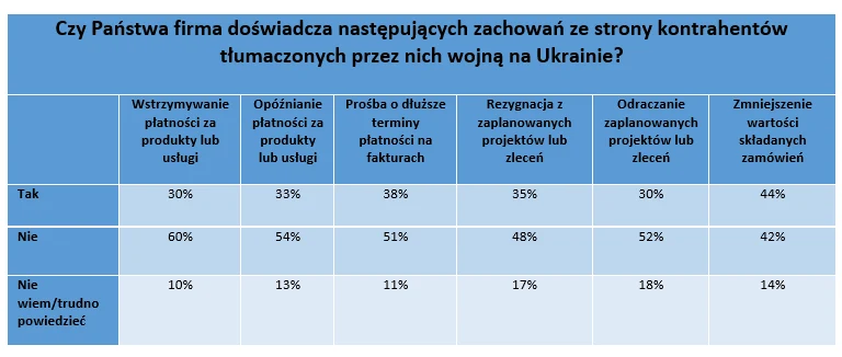 Czy Państwa firma doświadcza następujących zachowań ze strony kontrahentów tłumaczonych przez nich wojną na Ukrainie?