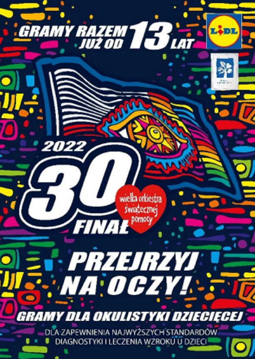Przez 12 lat wspólnego grania z Wielką Orkiestrą Świątecznej Pomocy, sztab Lidl Polska przekazał na cele Fundacji aż 33 miliony złotych. W tym roku zbiórka na rzecz WOŚP w sklepach Lidla odbędzie się już po raz 13. Będzie trwać od 20 grudnia aż do 30 stycznia. Celem akcji jest zapewnienie najwyższych standardów diagnostyki i leczenia wzroku u dzieci. Będzie to pierwszy Finał w całości dedykowany dziecięcej okulistyce. Zbiórka zakończy się 30 stycznia. Lidl Polska podczas wydarzenia podsumuje tegoroczną zbiórkę.