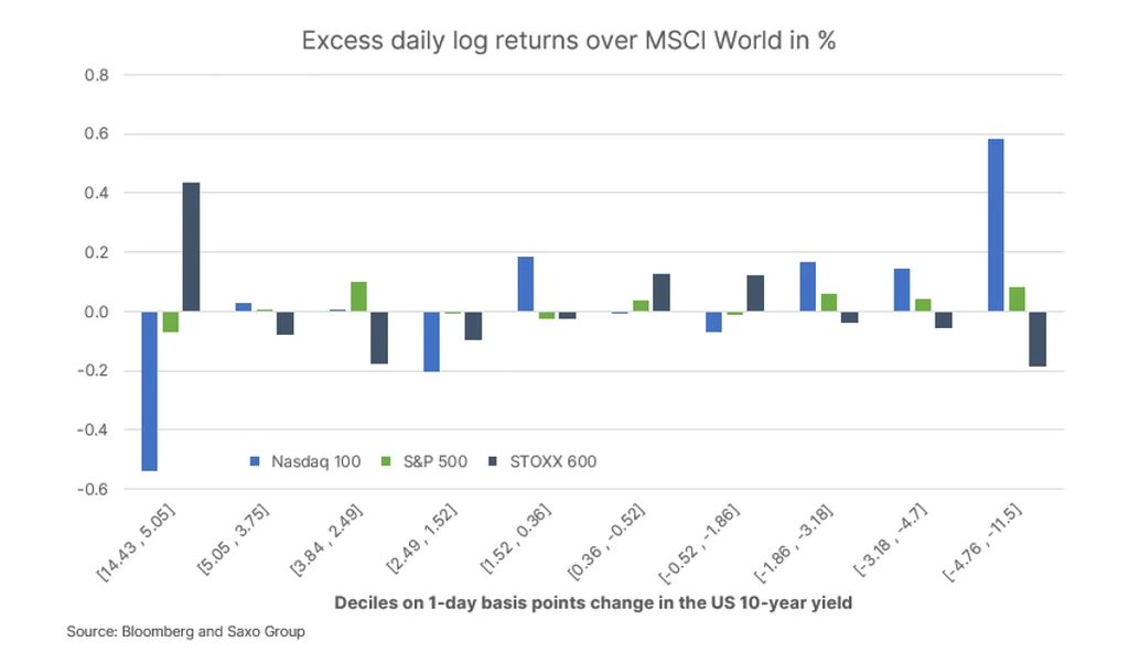 Akcje amerykańskich spółek technologicznych cechuje ujemna nadwyżkowa stopa zwrotu w porównaniu z akcjami globalnymi w dniach, w których rentowności długoterminowe idą w górę, natomiast akcje europejskie wykazują pozytywną nadwyżkową stopę zwrotu ze względu na fakt, iż przeważają wśród nich spółki finansowe, energetyczne i wydobywcze.