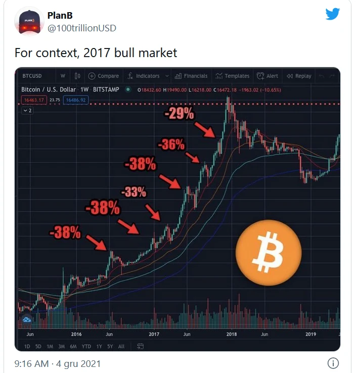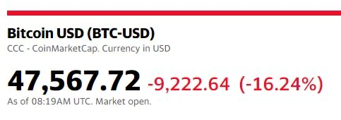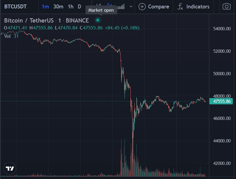 Nurkowanie rozpoczęło się około godziny 04:51, gdzie kurs bitcoina z ponad 51 tys. poleciał gwałtownie w dół i o godzinie 05:30 cena oscylowała już w okolicach 43 tys. dolarów. Od tego czasu BTC drobił cześć strat, a kurs wzrósł do poziomu ponad 49 tys. dolarów.