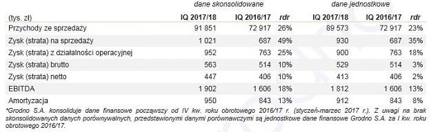 Skonsolidowane przychody Grupy Grodno, uwzględniające dane spółki BARGO przejętej w lutym br., wyniosły 91 851 tys. zł, czyli o 26% więcej rdr. Jednocześnie Grupa wykazała wzrost pozycji wynikowych - zysk operacyjny wyniósł 952 tys. zł (+25% rdr), EBITDA 1 902 tys. zł (+18% rdr), natomiast zysk netto 447 tys. zł (+10% rdr).