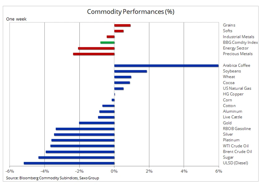 Sektor rolny ponownie zyskał, choć tempo tego wzrostu było wolniejsze, niż w ciągu ostatnich trzech tygodni. Na wyniki tego sektora pozytywnie wpłynęły obawy o warunki pogodowe, ogólne osłabienie dolara, mocny popyt w Chinach na kluczowe produkty rolne, a także ożywienie gospodarcze następujące po załamaniu w I kwartale. W ubiegłym tygodniu pięć surowców odnotowujących najlepsze wyniki stanowiły produkty rolne: liderem była kawa, a kolejne miejsca zajęły soja i pszenica.