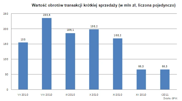 Po wielu latach wysiłków giełdy, zmierzających do wprowadzenia możliwości krótkiej sprzedaży papierów wartościowych, opartej na transakcjach pożyczkowych, instrument ten ruszył wreszcie w lipcu 2010 roku. Jak często bywa z nowymi instrumentami, nie obyło się bez kłopotów i perturbacji, zarówno z organizacją systemu pożyczania akcji, jak i rozliczania transakcji. Jednak już w pierwszym miesiącu jego funkcjonowania zawarto ponad 6 tys. transakcji o łącznej wartości 155 mln zł. Najlepszy pod tym względem był sierpień, kiedy zawarto ponad 10 tys. transakcji o łącznej wartości 235,6 mln zł. Ten miesiąc, ze względu na trwającą wówczas spadkową korektę, był szczególnie sprzyjający dla zawierania transakcji umożliwiających grę na zniżkę. WIG20 stracił wówczas ponad 6 proc. W kolejnych miesiącach obroty trzymały się na poziomie 168-198 mln zł. Jedynie w grudniu ubiegłego roku i w styczniu 2011 roku spadły do 66 mln zł.