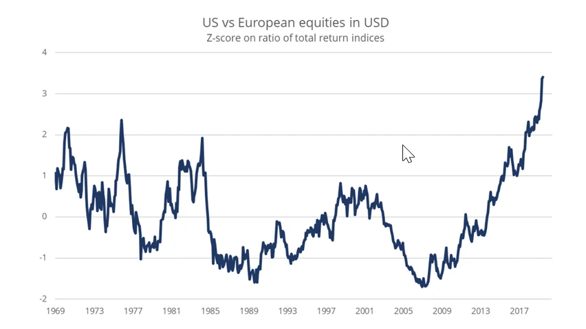W ubiegłym roku przewaga akcji amerykańskich nad europejskimi wzrosła do rekordowego poziomu w ujęciu historycznym. Od 2007 r. akcje spółek europejskich straciły względem akcji spółek amerykańskich mniej więcej pięć odchyleń standardowych w ujęciu względnym. Spowodowane to było mocnym USD, wyższymi wycenami akcji amerykańskich niż akcji europejskich, wyższym wzrostem zysków w Stanach Zjednoczonych w połączeniu z szeroko zakrojonymi programami odkupu akcji oraz przesunięciem tektonicznym kapitalizacji rynkowej w kierunku spółek technologicznych, czyli obszaru, w którym Europa pozostaje w tyle.