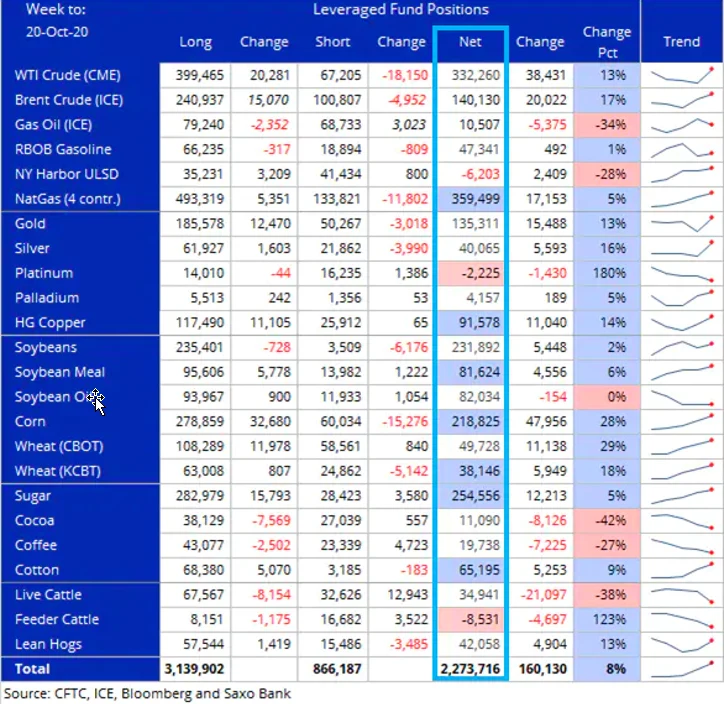 W najnowszym raporcie COT z 20 października łączna długa pozycja netto obejmująca 24 najważniejszych rynków kontraktów terminowych wyniosła 2,3 mln lotów, co stanowi najwyższy poziom od lutego 2017 r. Nowe wielomiesięczne maksima osiągnęły takie surowce, jak gaz ziemny, miedź HG, śruta sojowa, kukurydza, pszenica z Kansas, cukier i bawełna; liczne zlecenia kupna składano ponadto na ropę naftową i złoto. W sektorze upraw łączna długa pozycja netto sześciu kontraktów na soję, kukurydzę i pszenicę wyniosła 702 249 lotów, co stanowi najwyższy poziom od 2012 r. Wyraźnie odzwierciedla to mocne fundamentalne wsparcie, jednak równocześnie stanowi to ostrzeżenie, że ewentualne zmiany krótkoterminowe wiążą się z ryzykiem korekty.