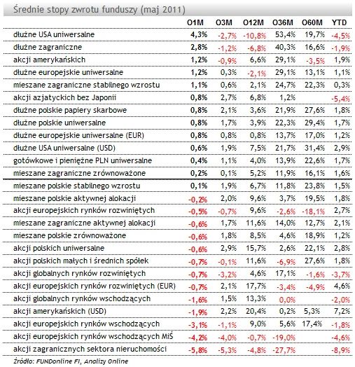 Najlepsze wyniki wypracowały w maju fundusze dłużne USA uniwersalne wyceniane w PLN (+4,3 proc.) oraz dłużne zagraniczne wyceniane w PLN (+2,8 proc.). To przede wszystkim efekt osłabienia się naszej waluty w stosunku do dolara, którego kurs wzrósł o +3,65 proc. i euro, które umocniło się o +0,5 proc. Należy jednak podkreślić, że wyniki tych funduszy w walutach obcych (USD i EUR) także były dobre. Fundusze dłużne USA uniwersalne wyceniane w USD zarobiły średnio +0,6 proc., a fundusze dłużne europejskie uniwersalne wyceniane w EUR +0,8 proc. W grupie funduszy obligacji USA notowanych w PLN najlepszą miesięczną stopę zwrotu wypracował UniDolar Obligacje (UniFundusze FIO) (+5,4 proc.) oraz PKO Papierów Dłużnych USD (ŚFW SFIO) (+4,1 proc.).