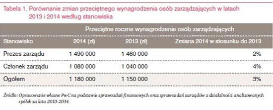 Poziom wynagrodzeń najwyższej kadry zarządzającej jest odzwierciedleniem sytuacji gospodarczej i wyników spółek, które kolejny rok utrzymują się na stabilnym poziomie. Łączne wynagrodzenie krótkoterminowe osób zarządzających spółkami wzrosło przeciętnie o ok. 3% w stosunku do 2013 roku.